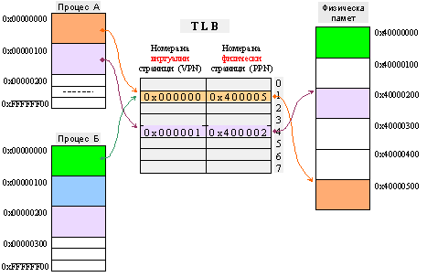 преобразува във физически с посредничеството на TLB, по описания вече начин. Когато на Процес А поиска